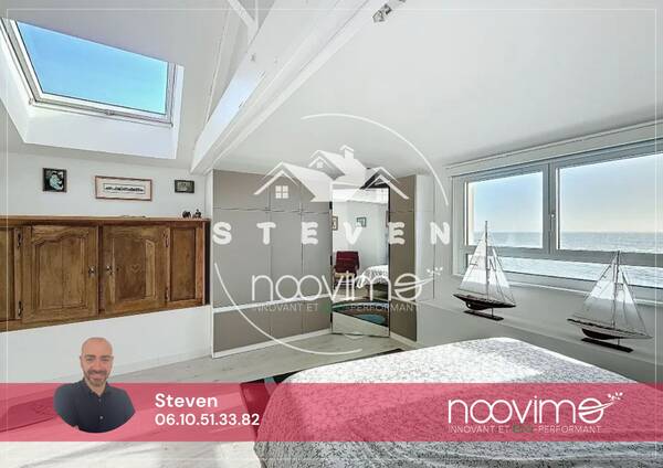 À l’étage, l’ambiance se prolonge avec une mezzanine de 11 m² aménagée avec des rangements sur mesure qui peut faire office de bureau et/ou de coin nuit d’appoint, selon vos besoins. Deux belles chambres complètent l’ensemble : l’une d’environ 12 m², confortable et lumineuse ; l’autre de plus de 14 m² avec des placards sur mesure, et surtout une VUE MER PANORAMIQUE à couper le souffle, le luxe de se réveiller face à l’océan. Et parce que le confort ne se limite pas au design, un second WC est également prévu à l’étage.