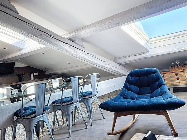 Sous les toits, cet espace de vie ouvert et lumineux offre une ambiance chaleureuse et atypique. Vous y trouverez deux espaces de couchage dont une chambre confortable, une salle d'eau indépendante et des rangements astucieux.